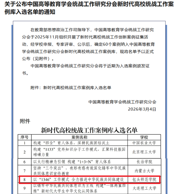 近日,由教育部思想政治工作司指导、中国高等教育学会统战工作研究分会组织的新时代高校统战工作创新案例库评选结果正式公布。我校申报的统战工作创新案例《以“1346”工作模式 全力推进中华民族共同体建设》,经学校申报、专家评审及结果公示,从众多参评案例中脱颖而出,成功入选。